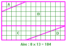 Se puede también explicar el resultado observando que los puntos M, P y R no están alineados. Era pues un error de reconstitución. Es difícil verlo (desplaza la recta de encima), ya que de hecho los segmentos MP y QR son paralelos pero con PQ...lo que resulta aberrante.Volvemos a encontrarnos una vez más, los números 5, 8, 13, 21 que forman parte de la sucesión de Fibonacci. Si elegimos dos números consecutivos de la sucesión para longitud y anchura de un rectángulo y los que lo encuadran para el otro rectángulo, obtenemos alternativamente una ganancia o una pérdida de 1 unidad.