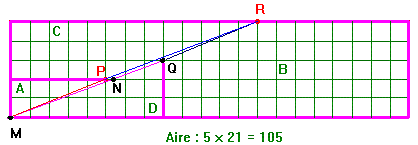 Miremos bien la figura : los puntos P y N no están confundidos contrariamente se puede pensar en la figura reconstituida. La figura C es de hecho el polígono limitado por PR y no NR. Del mismo modo la figura A está limitada por MP y no MN. La figura B está limitada por QR y D por MQ que pasa por N.