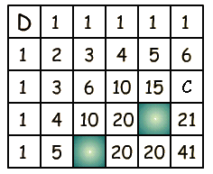 Pour arriver en C, nous sommes obligés de passer par la case juste au-dessus (chemin de longueur 6 avec 5 pas à droite et 1 vers le bas) ou par celle juste à sa gauche (longueur 6 avec 4 pas à droite et 2 vers le bas).