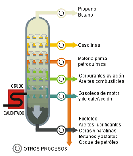 este modo se obtienen: gases, gasolina, queroseno, gasóleo, lubricantes, fuel y