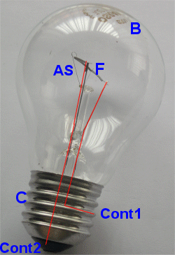 Del filamento salen unos alambres conductores (en rojo en la foto) que