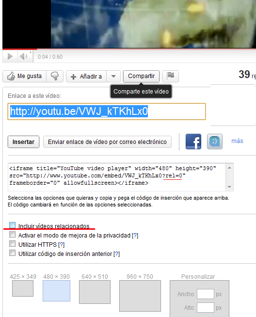 Prueba 3 Desactivo la opción por defecto de Incluir vídeos relacionados, ya que estoy tratando de hacer un único vídeo transparente, y copio el nuevo código de inserción del vídeo de Youtube.